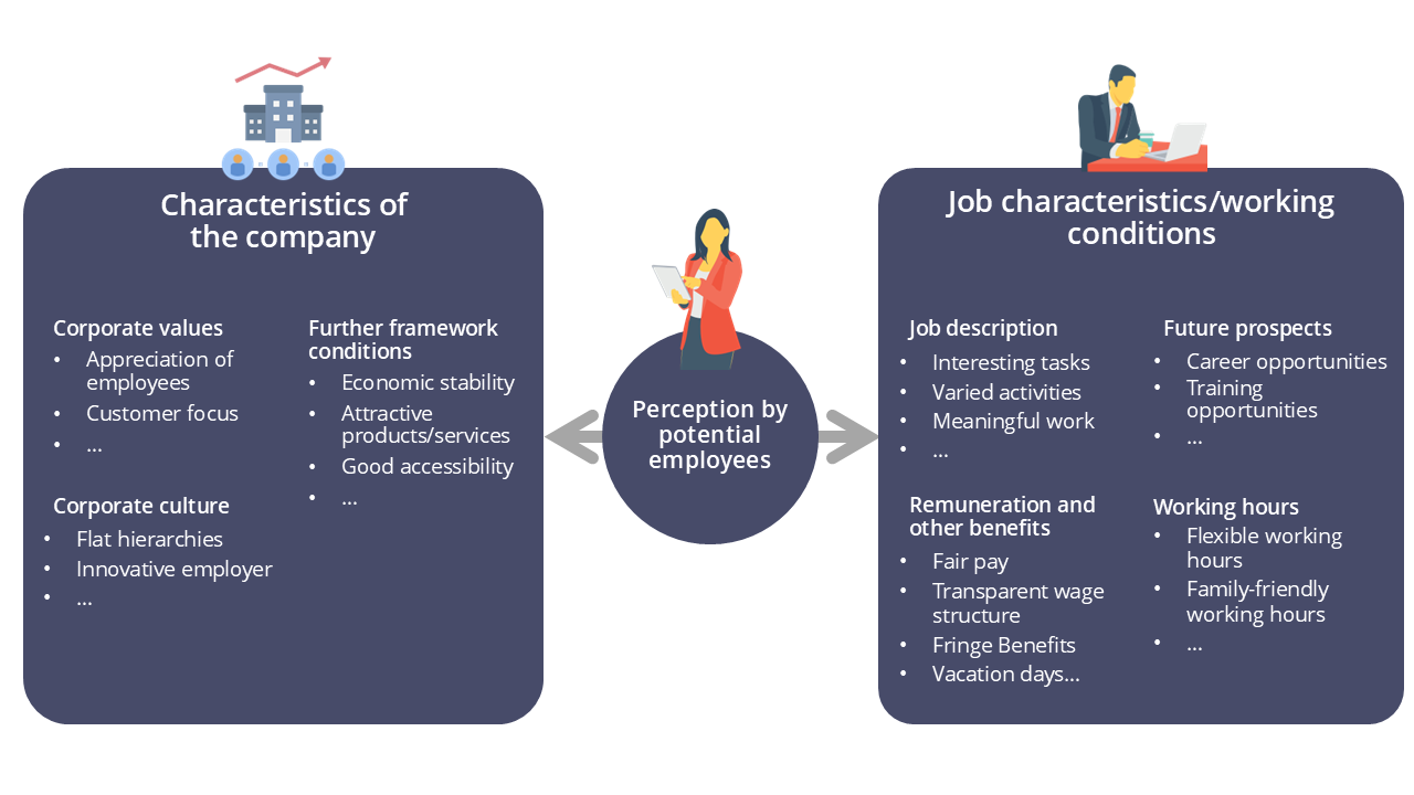 Our employer branding model uses established measurement dimensions and instruments. These dimensions (including tasks/development, culture/leadership, purpose/values, flexibility/work-life balance, compensation/benefits, location/working environment) are tailored precisely to your EVP.