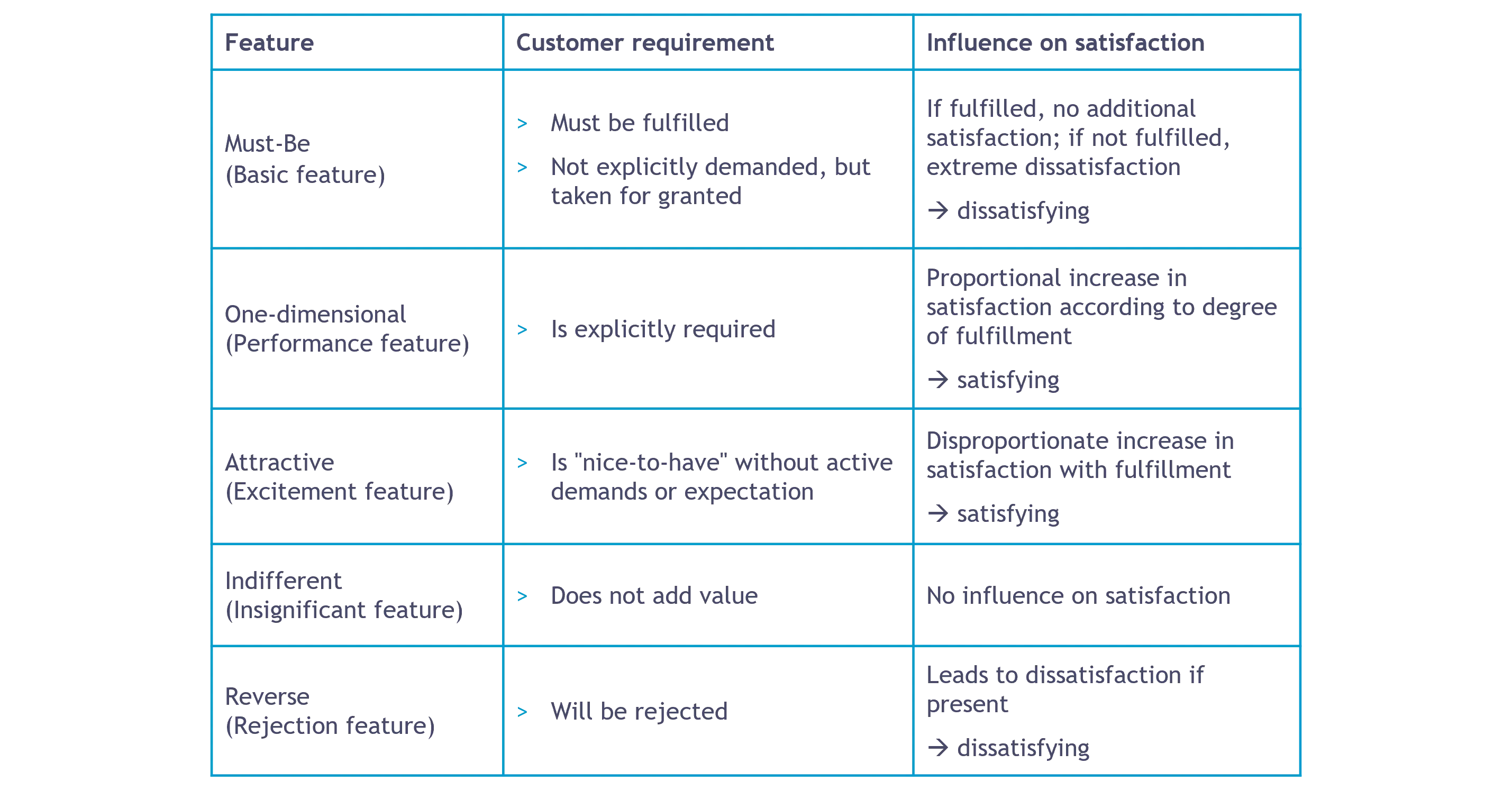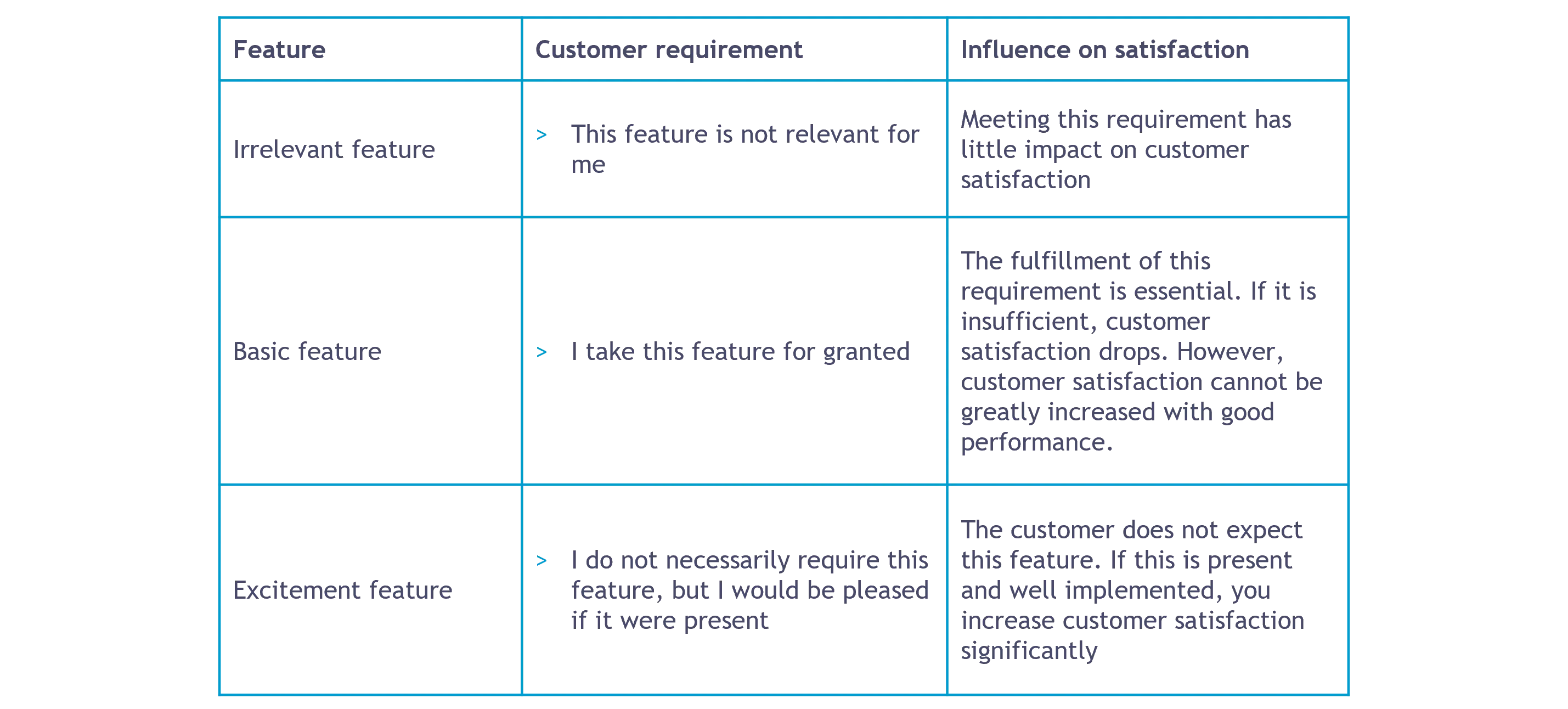 Especially in the case of complex products or services, the performance characteristics that influence customer benefit and customer satisfaction can be very diverse. The Kano model can be used to analyse the relationship between the individual characteristics of a product or service and customer satisfaction. This is named after Noriaki Kano, who researched customer requirements and customer wishes in Japan in the 1970s and related product features and their degree of fulfilment to customer satisfaction. His research showed that product characteristics can be divided into several groups, which are categorised as follows.