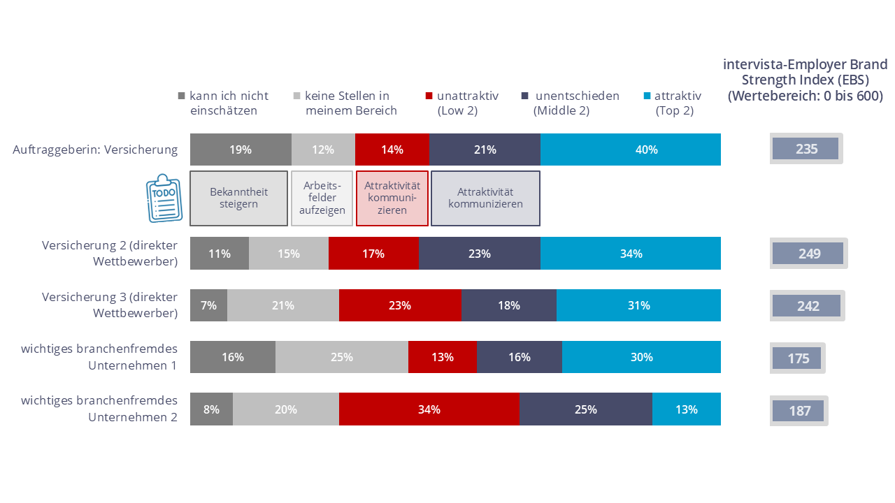 Zusätzlich arbeiten wir mit innovativen Messgrössen wie unserem Employer Brand Strength Index (EBS) sowie fundierten Methoden wie der Analyse von Treibern und Hygienefaktoren.