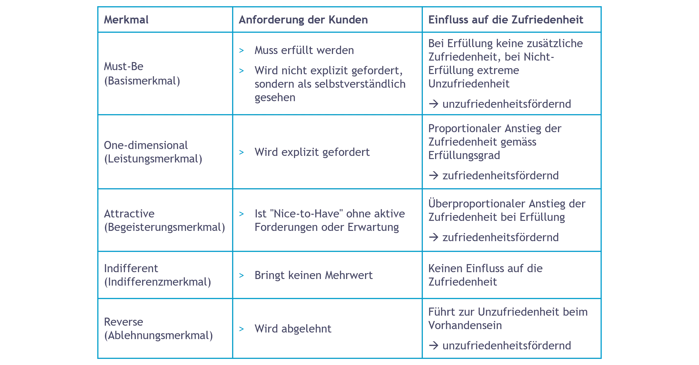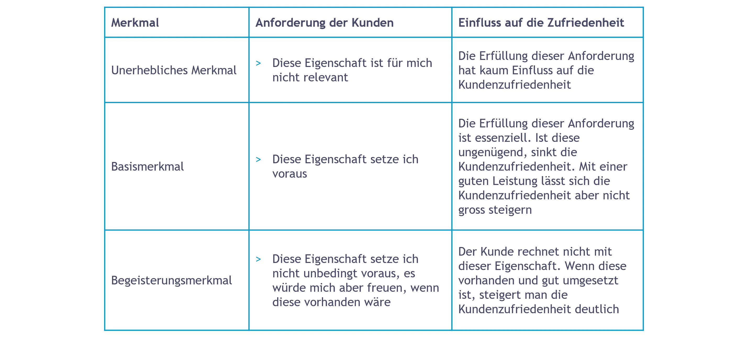 Insbesondere bei komplexen Produkten oder Dienstleistungen können die Leistungsmerkmale, welche den Kundennutzen und die Kundenzufriedenheit beeinflussen, sehr vielfältig sein. Um zu analysieren, welcher Zusammenhang zwischen den einzelnen Eigenschaften eines Produkts oder einer Dienstleistung und der Kundenzufriedenheit besteht, kann das Kano-Modell eingesetzt werden. Dieses ist benannt nach Noriaki Kano, der in den 1970er-Jahren in Japan Kundenanforderungen und Kundenwünsche erforscht und dabei Produktmerkmale und deren Erfüllungsgrad in Beziehung zur Kundenzufriedenheit gesetzt hat. Aus seiner Forschung ergab sich, dass Produktmerkmale in mehrere Gruppen eingeteilt werden können, die folgendermassen kategorisiert werden.