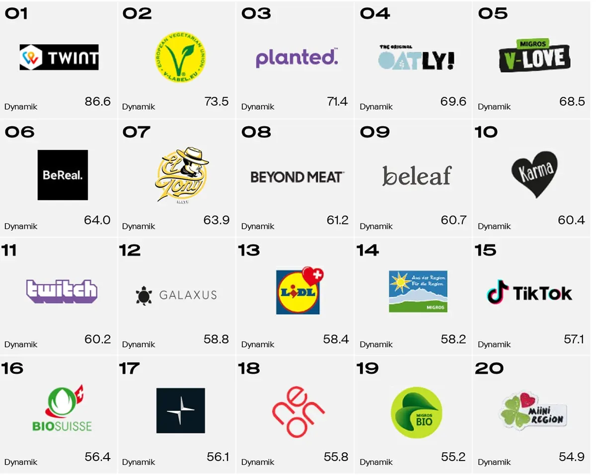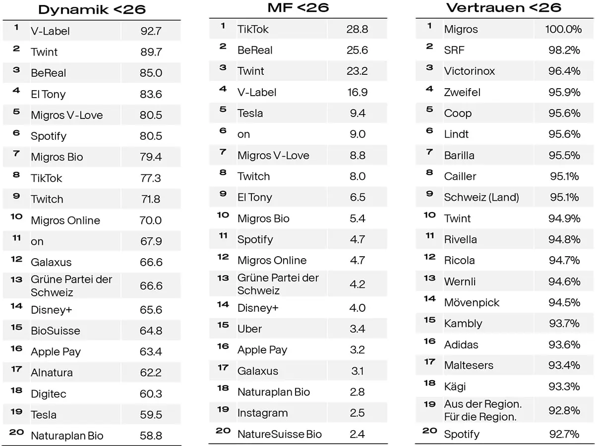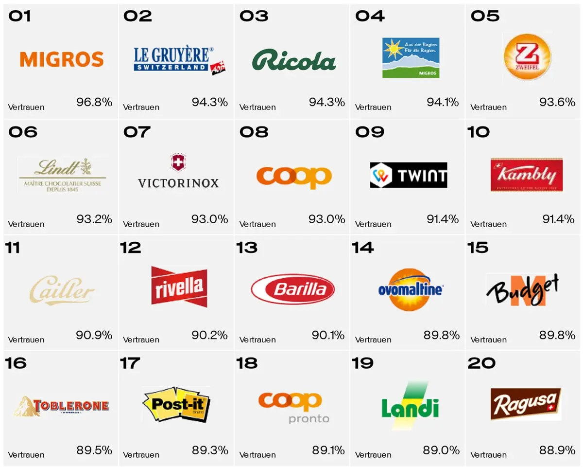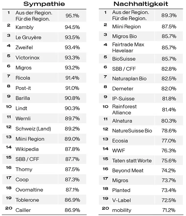 Dabei zeigt sich: Schweizer Traditionsmarken geniessen in der Bevölkerung ein grosses Ansehen. Schweizer Konsument:innen neigen zudem dazu, nachhaltige Marken als sympathischer zu bewerten. Die Wahrnehmung einer Marke beeinflusst unter anderem die Kaufbereitschaft der Konsument:innen. Mit relevanten Insights zur Wahrnehmung ihrer Marke(n) stehen Unternehmen wirksame Hebel zur Verfügung, um ihre Marketing-Aktivitäten strategisch zu optimieren.